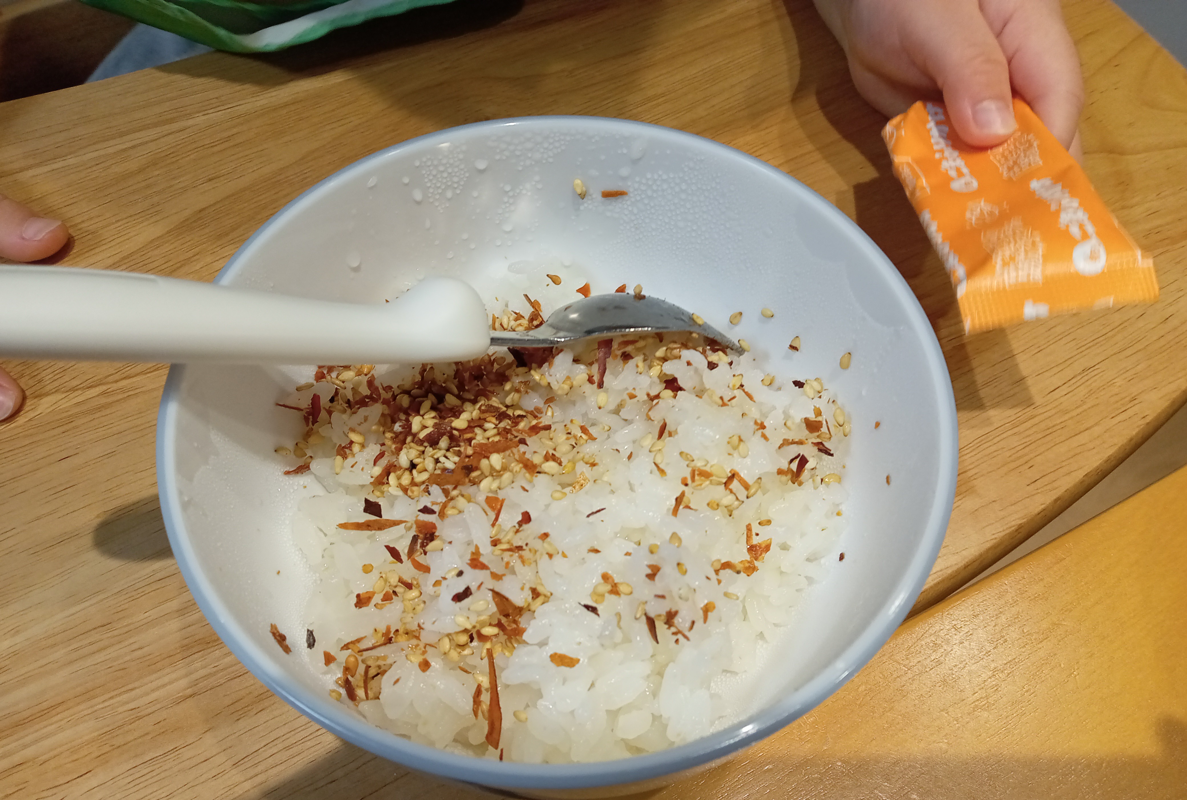うちの1歳3歳の子どもたちも、白米ではあまり食べがよくないのですが、ふりかけをかけるとご飯をよく食べてくれます。