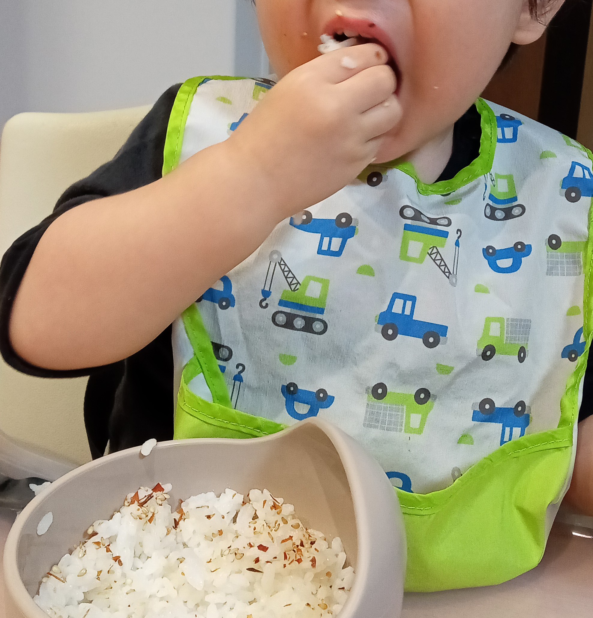 ふりかけをかけた途端練習中のスプーンは机に置き、手づかみで爆食いし始めました(笑)