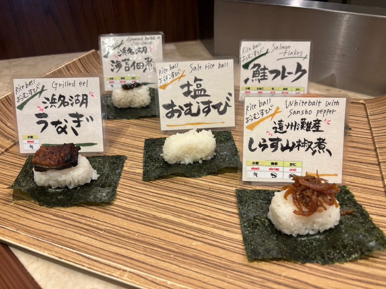 浜名湖鰻、海苔佃煮、しらす山椒煮、鮭、塩むすびの5種類があります。