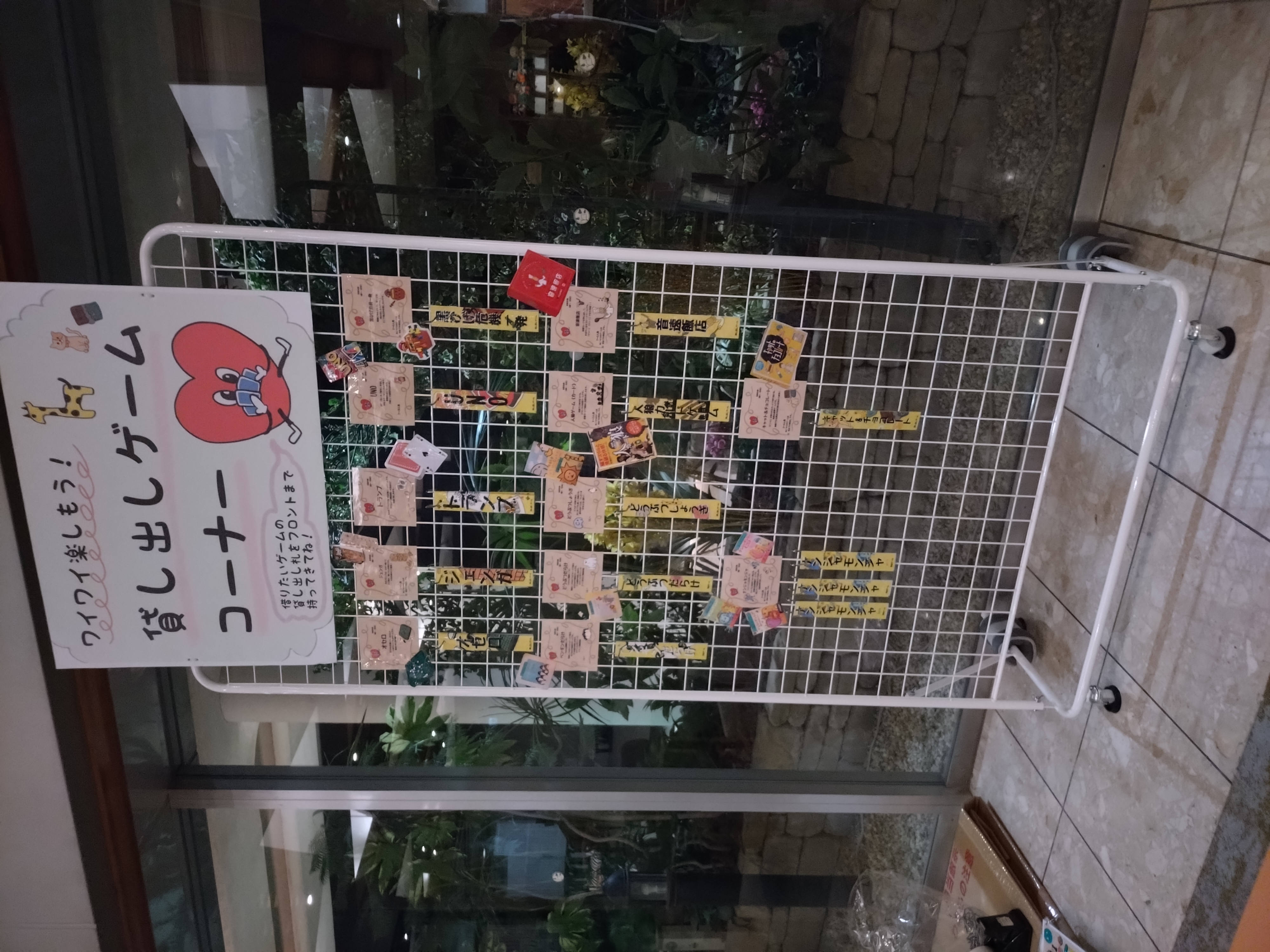 フロントでは以前より、お部屋でお楽しみいただくためにカウンターにて一覧表から借りたいものを選ぶ方式でゲーム類の貸し出しをしていたのですが、より分かりやすく、目立つようにコーナーを設置する運びとなりました。