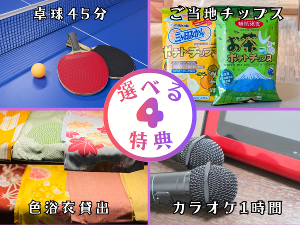 ②特典チョイスチケット(卓球・カラオケ・ご当地チップス2袋・色浴衣)